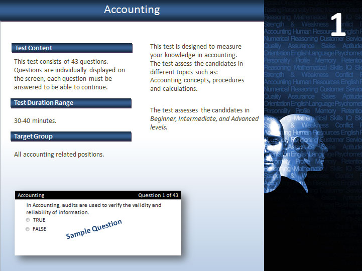 Measuring specific skills in accounting and Finance accurately and precisely can be difficult without a reliable tool. The Accounting & Finance category will help you evaluate candidates’ ability to use and understand financial documents and accounting terminology to ensure solid hiring decision.