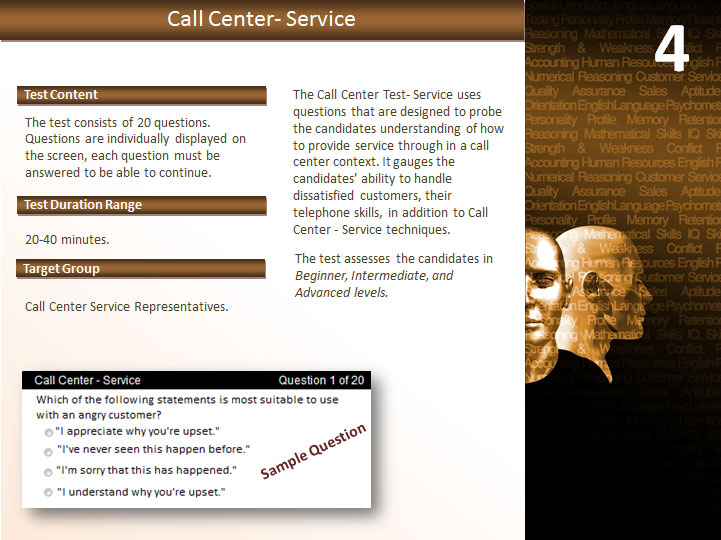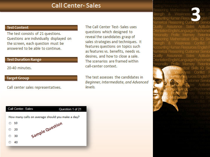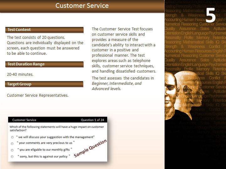 To build and maintain a strong business reputation, the Sales & Clients Relations category provides a comprehensive battery of tests to accurately measure fundamental areas of employees/candidates’ skill and knowledge when selling and communicating with clients to ensure quality performance. The consequences of hiring sales staff, customer service representatives and call center agents who exhibit poor performance will result in loos of your company a because as we know client relations are the deciding factor between a successful business and one that is not.