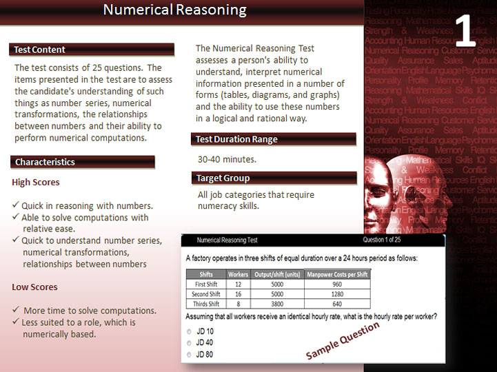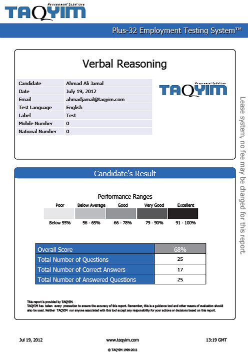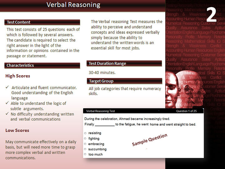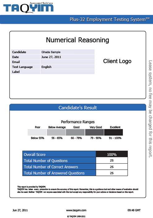 The purpose of using Reasoning tests is to scientifically measure individuals’ process of forming conclusions and judgments drawn from information of various forms. Employees and candidates with high level of reasoning skills are most likely to formulate logical and sound actions. Whether it is understanding and interpreting concepts framed in words or analyzing statistical and numerical data, reasoning skills are critical to many positions.